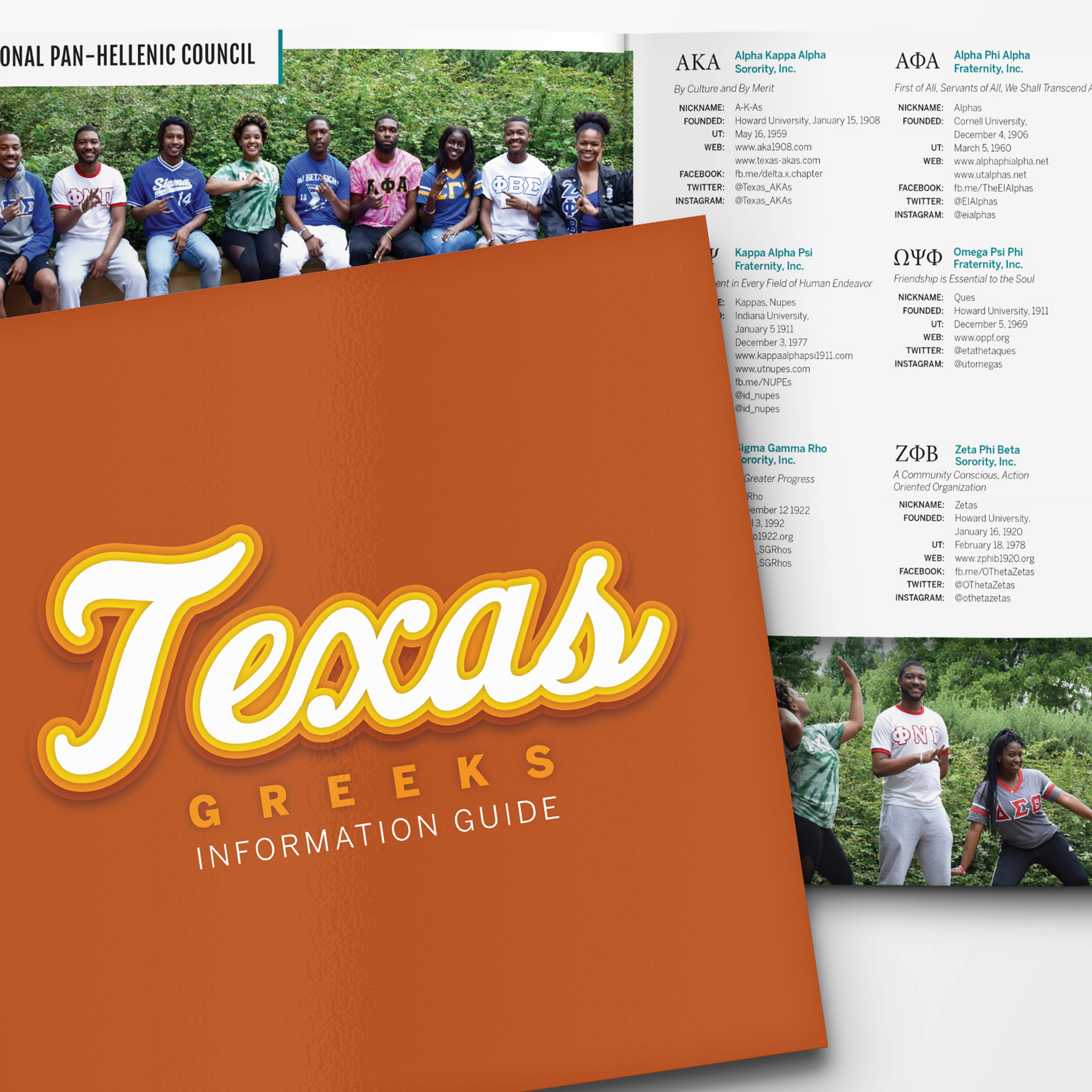 The Sorority and Fraternity Life Texas Greek Information Guide was is an annual project, in conjunction with the Sorority and Fraternity Life information mailer. Sent out to students to give them an detailed guide about official Greek life organizations at The University of Texas at Austin.