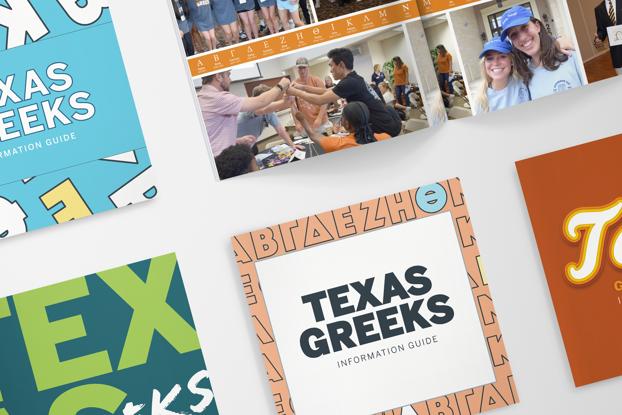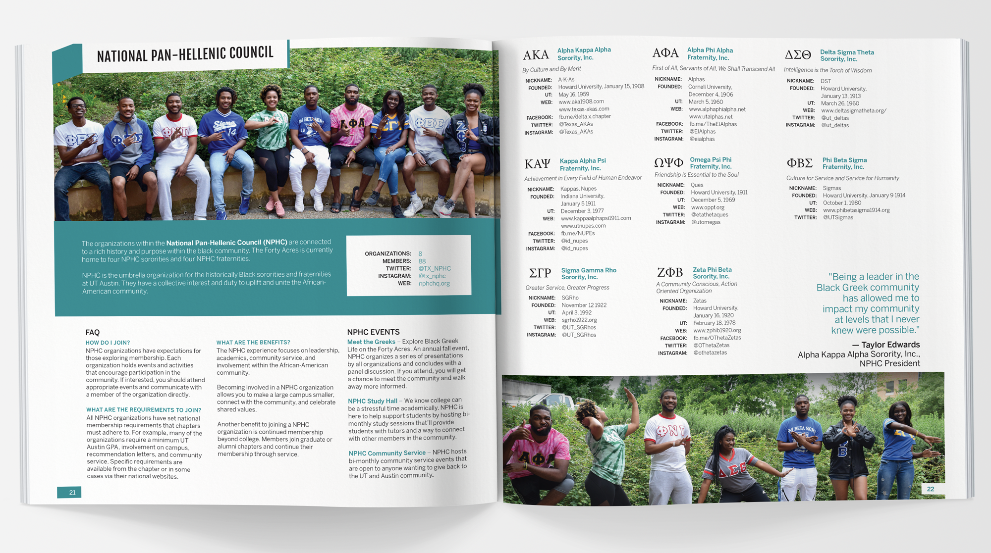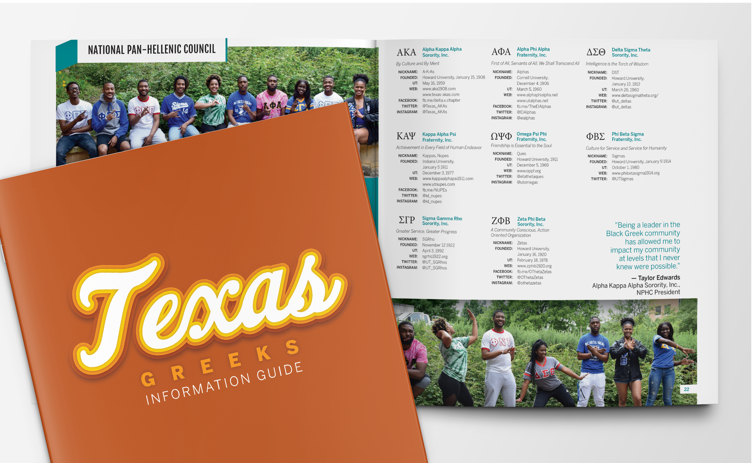 The Sorority and Fraternity Life Texas Greek Information Guide was is an annual project, in conjunction with the Sorority and Fraternity Life information mailer. Sent out to students to give them an detailed guide about official Greek life organizations at The University of Texas at Austin.