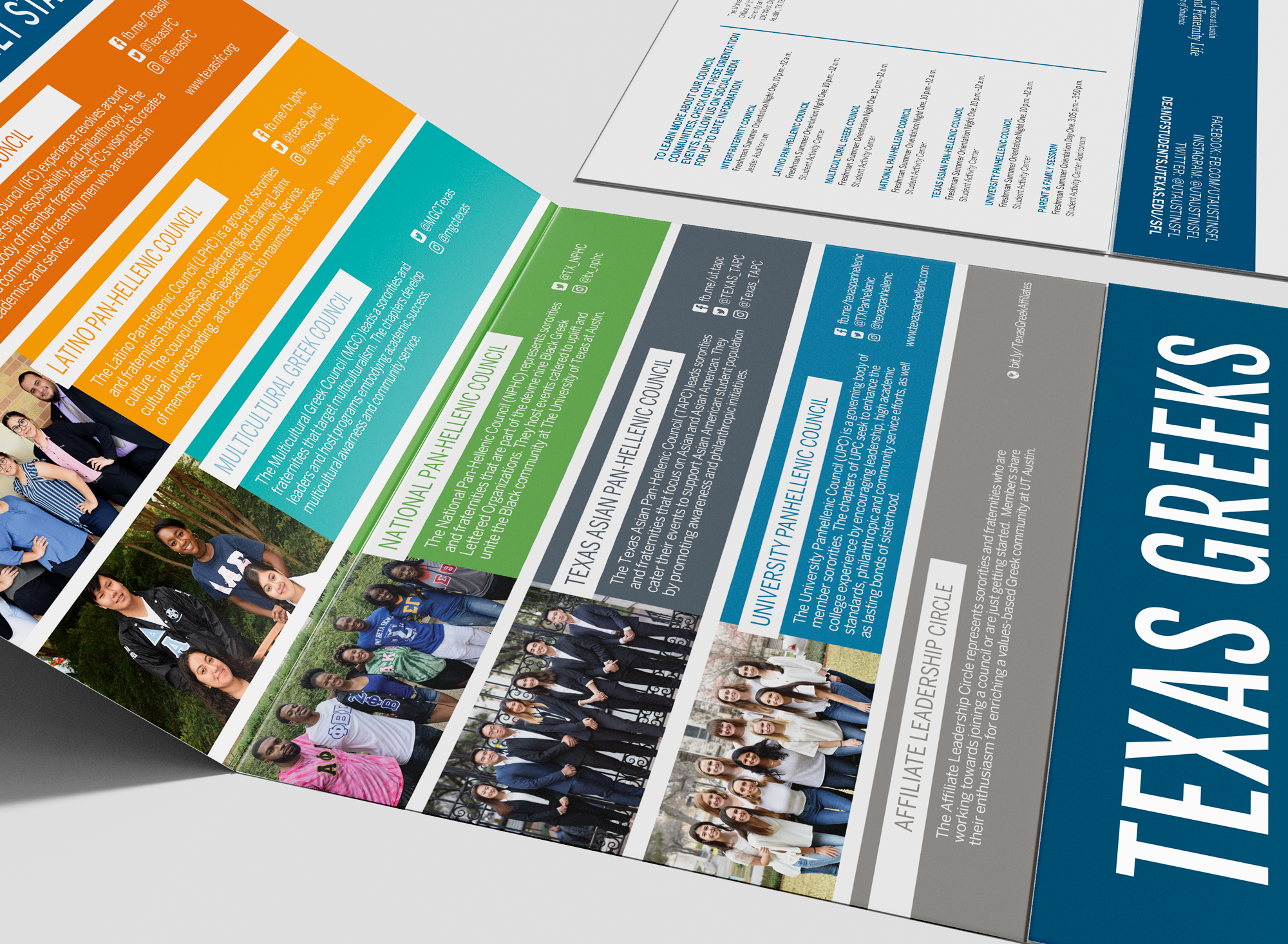 Included in the booklet design, a similarly designed mailer would be sent out to students. This mailer was a very condense brochure version of the guide, with all official UT Austin Greek organizations. And just like the main document, the layout of the brochure needs to be strategically adjustment. While upholding the set branding guidelines.